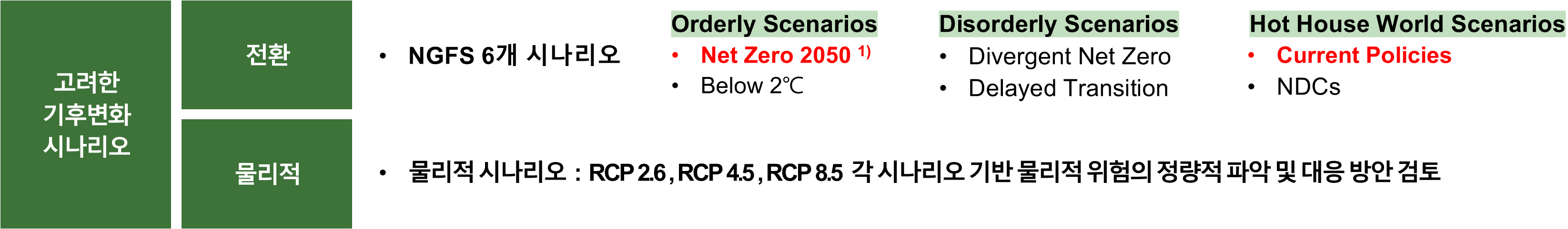 분석에 활용된 주요 시나리오는 녹색금융협의체(NGFS, Network for Greening the Financial System)가 제시한 전환 시나리오(1.5°C 및 3°C 경로)와 기후변화에 관한 정부간 협의체(IPCC, Intergovernmental Panel on Climate Change)의 대표 농도 경로(RCP, Representative Concentration Pathways, 2.6, 4.5, 8..5) 시나리오입니다. 특히 총 6개의 NGFS 시나리오 중 국내 정책 방향과 정합성이 높은 ‘Orderly Net Zero 2050’ 경로를 중심으로 분석을 실시하였으며, RCP 시나리오는 온실가스 농도와 기온 상승 간 상관관계를 바탕으로 물리적 위험을 정량적으로 파악하는 데 활용했습니다.