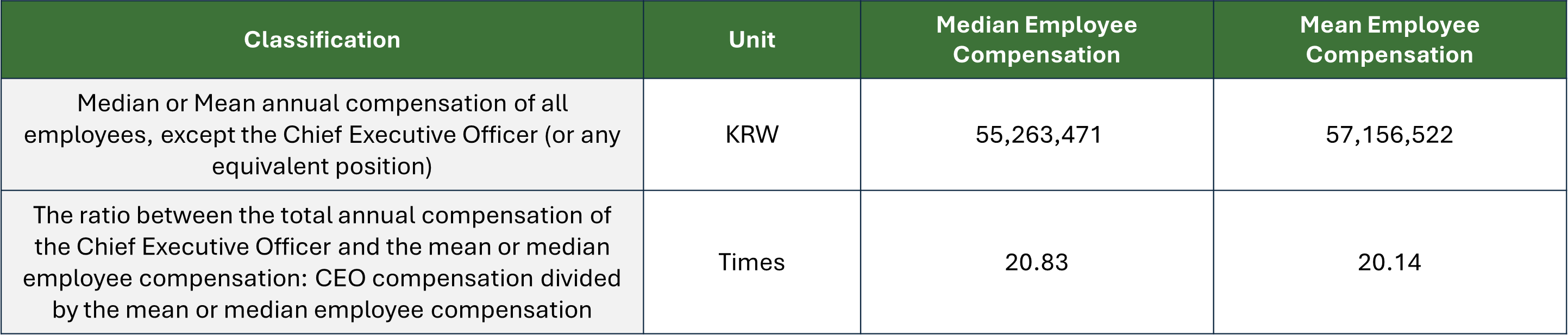 The total annual compensation for Pulmuone's CEO in 2024 was KRW 1,151,000,000 as disclosed in the business report. The median and average employee compensation compared to the total CEO compensation are disclosed in the table below.