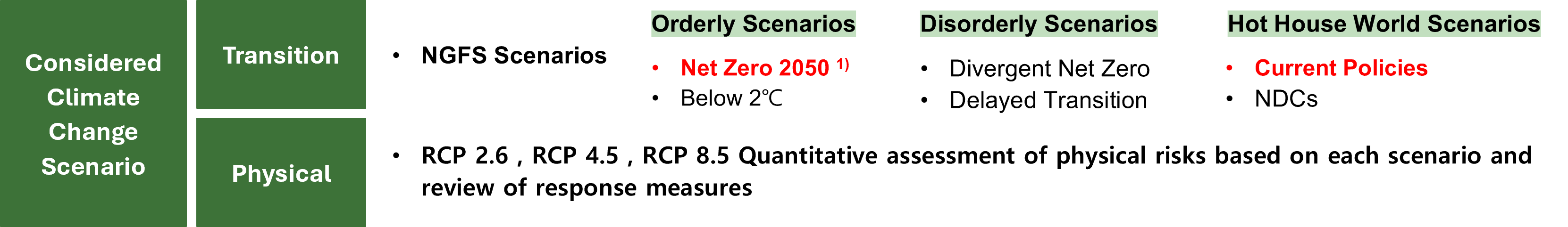 The key scenarios used in the analysis are the transition scenarios (1.5°C and 3°C pathways) proposed by the Network for Greening the Financial System (NGFS), and the Representative Concentration Pathways (RCP 2.6, RPC 4.5, RPC 8.5) scenarios from the Intergovernmental Panel on Climate Change (IPCC). Among the six NGFS scenarios, we primarily focused on the Orderly Net Zero 20501) scenario, as it closely aligns with national policy directions. The RCP scenarios were applied to quantitatively assess physical risks, based on the correlation between GHG concentrations and temperature increases.